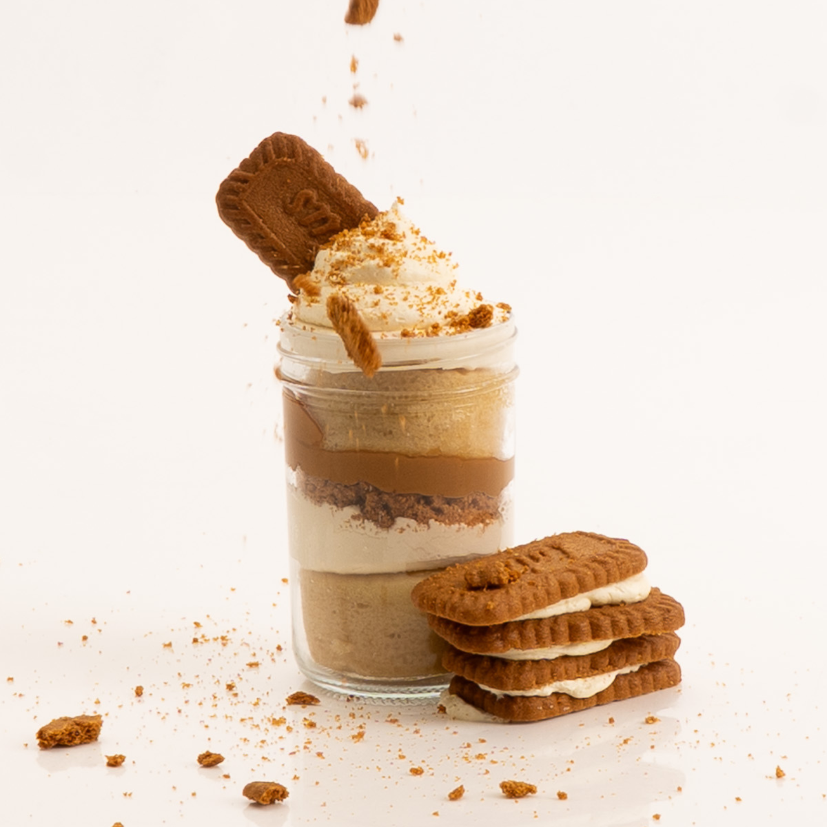 Dairy-free Biscoff dessert jar with caramelised biscuit flavour.