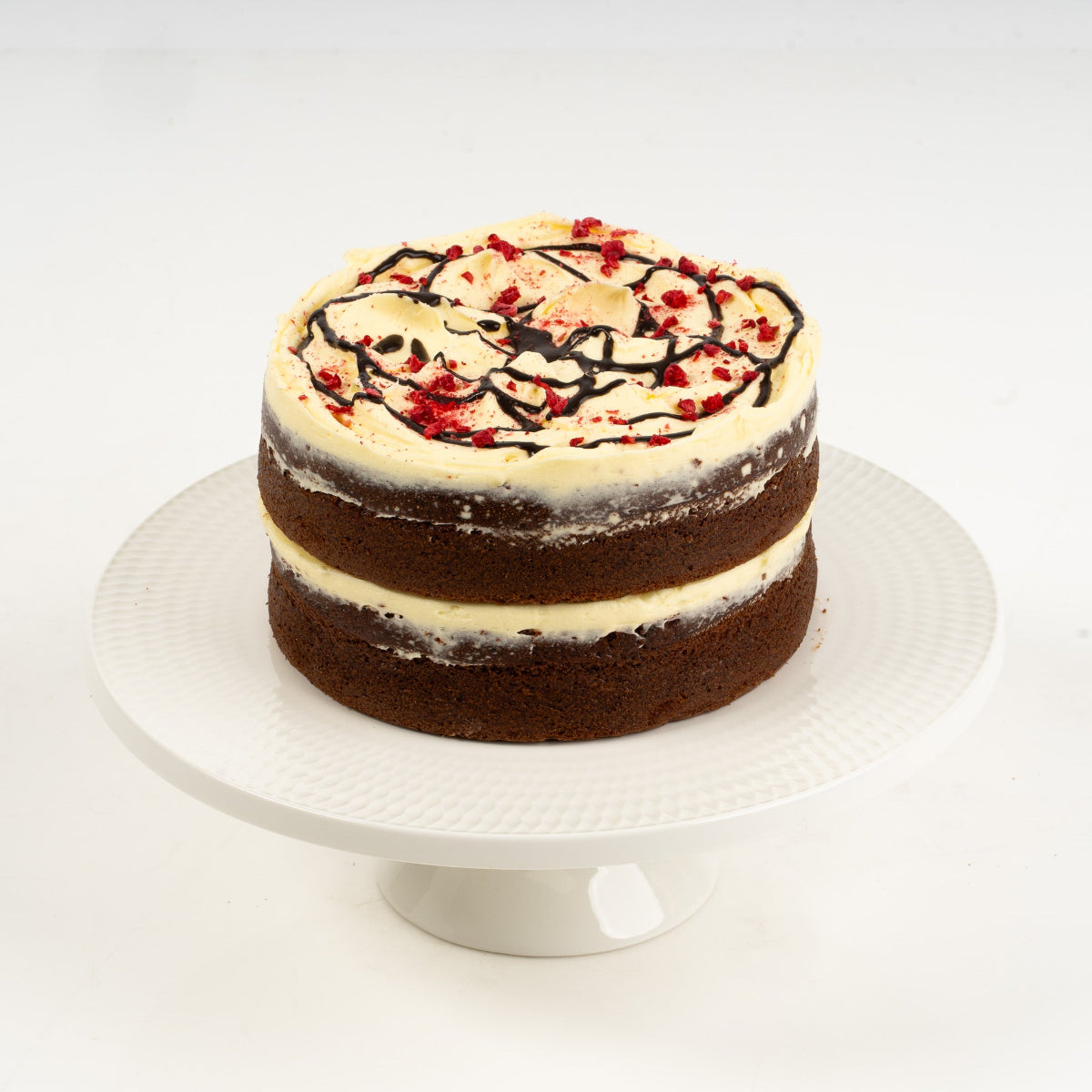 Tender crimson sponge with a gentle cocoa undertone, layered with cream cheese buttercream. The frosting is smooth and lightly tangy, balancing the sweetness of the cake. Each slice is soft, velvety, and perfectly balanced - a classic flavour that feels both comforting and indulgent.