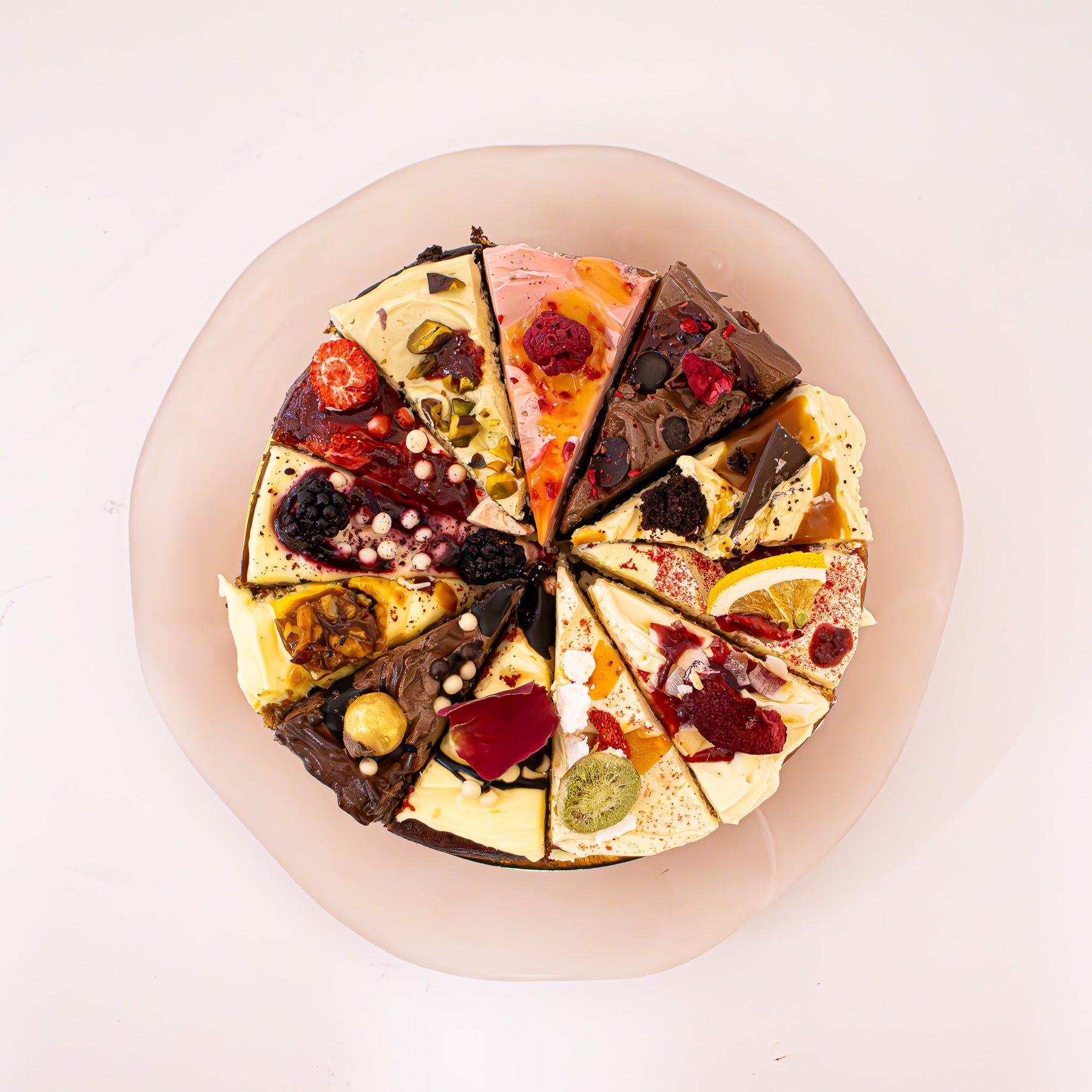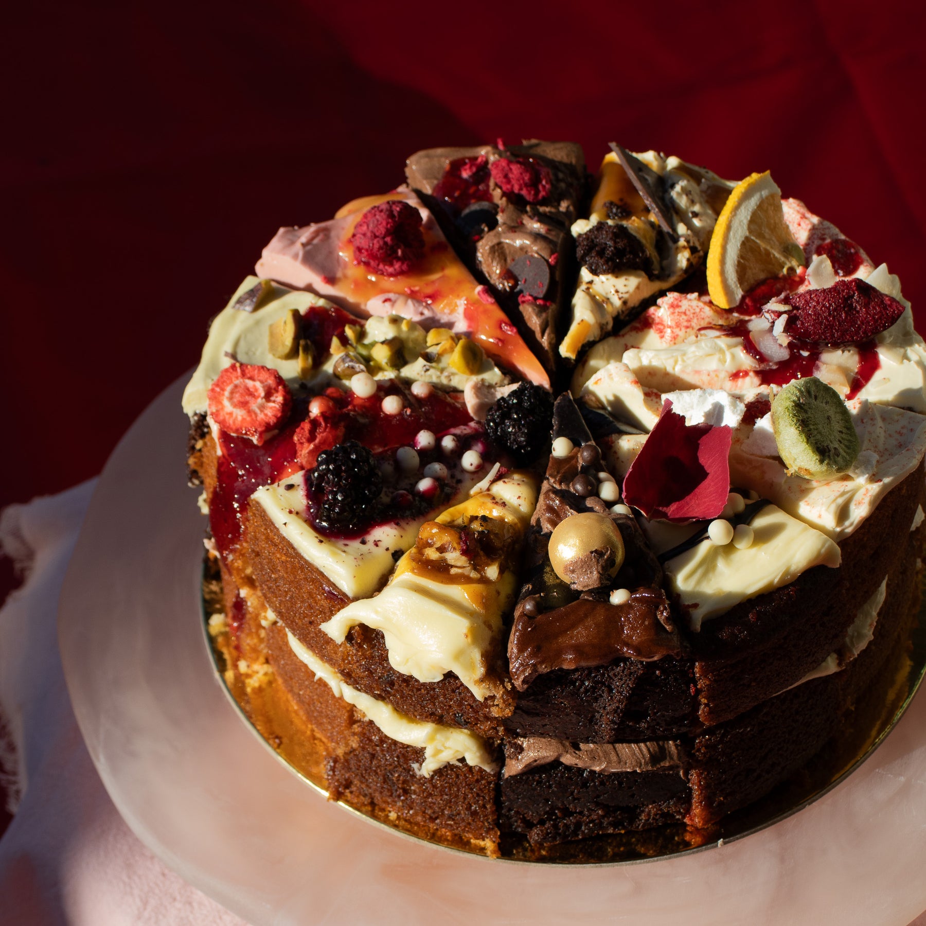 From fruity delights to rich chocolates, each slice offers a unique indulgence. This cake is ideal for celebrations, sharing, or treating yourself to a flavour-packed adventure. Plus, with vegan options included, there’s something for everyone.